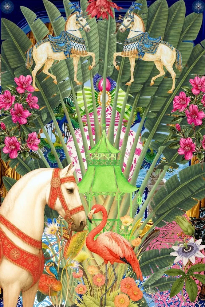 In einem üppigen Heiligtum aus überdimensionalen Palmen und blühender Schönheit begegnen sich ein weißes Pferd und ein Flamingo Auge in Auge - zwei anmutige Wesen aus verschiedenen Welten, die sich in göttlicher Anerkennung befinden. Hinter ihnen erhebt sich ein zarter grüner Tempel, der vom Dschungel umschlossen ist und von zwei himmlischen Pferden bewacht wird. Dieses Bild strahlt Harmonie, Ehrfurcht und die Erinnerung an die heilige Vereinigung aller Lebensformen aus. Es spricht von stiller Weisheit und von Schönheit als einer universellen Brücke.