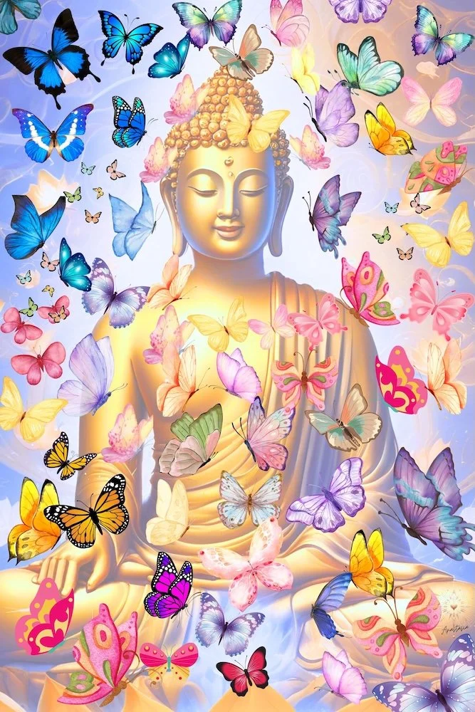Ein goldener Buddha strahlt heitere Weisheit aus, umgeben von leuchtenden Schmetterlingen - Boten der Transformation, der Freude und des Erwachens der Seele. Dieses Kunstwerk trägt die Frequenz der Bewegung in der Stille und lädt dich ein, dich an deine wahre, spielerische und lichtvolle Essenz zu erinnern.
