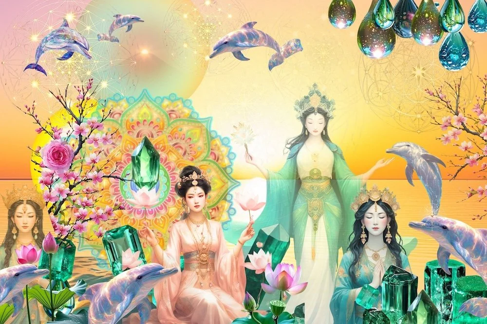 Emerald crystals, dolphins, and lotus blossoms dance in harmony with ascended beings, emanating a vibration of healing, remembrance, and inner peace.