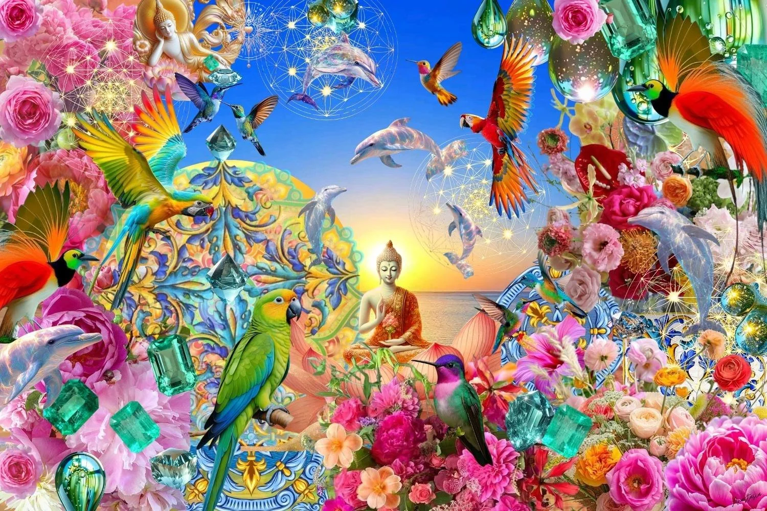 Parrots, hummingbirds, and dolphins move through crystalline mandalas and floral dimensions, creating a field of soundless music.