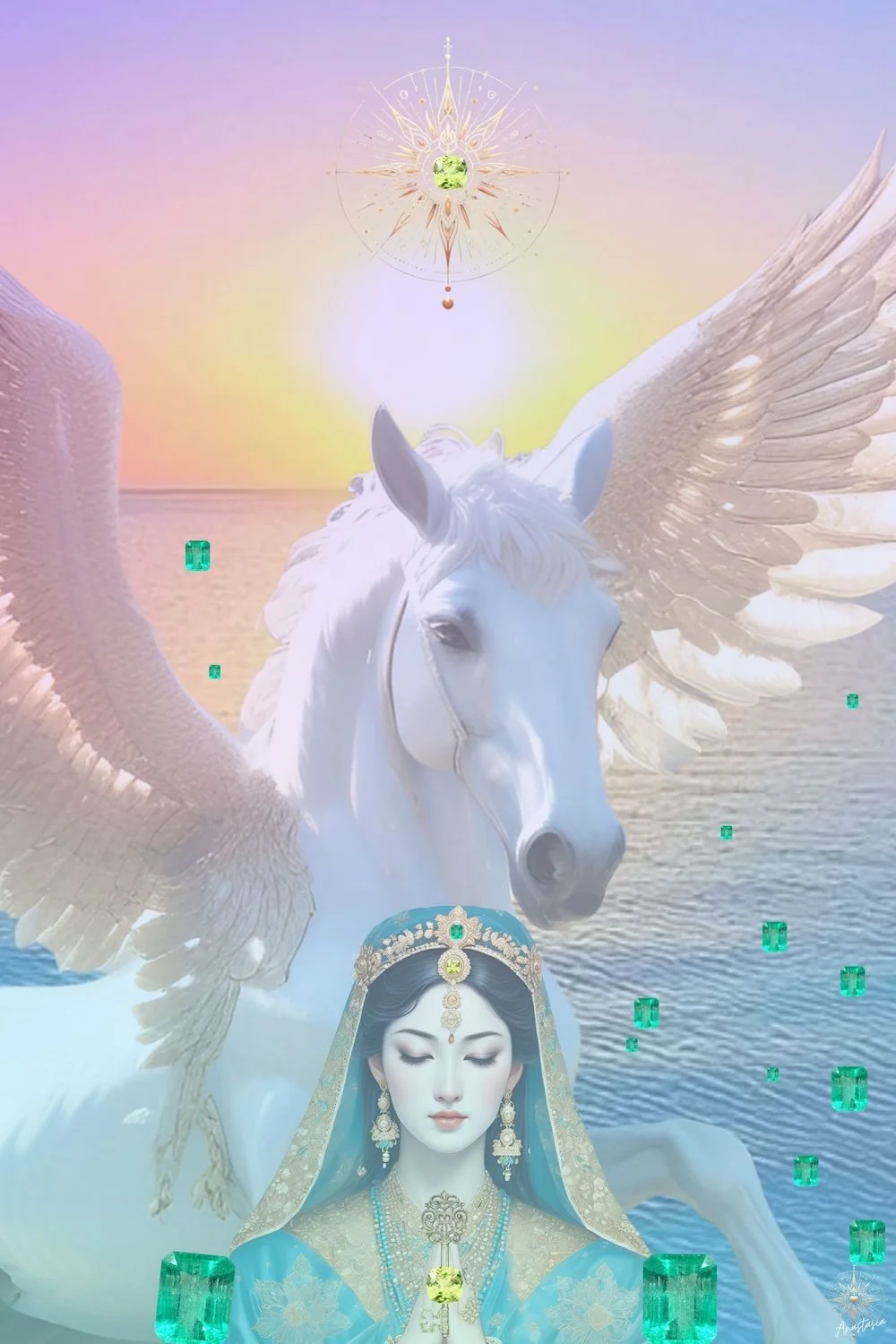 A celestial Pegasus emerges from the rising light of dawn – a messenger of divine motion and cosmic guidance. Before it stands the Emerald Priestess, a living key of light. She carries the remembrance of the soul’s golden wisdom: dignity, truth, and luminous reconnection.